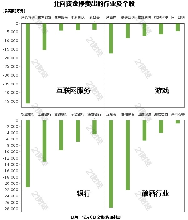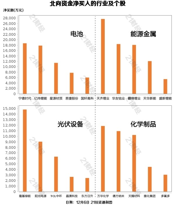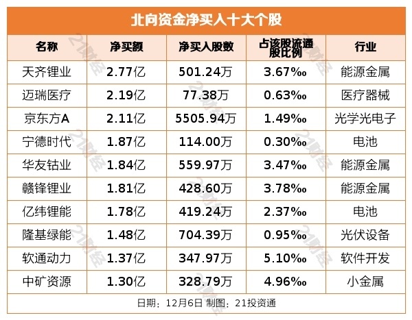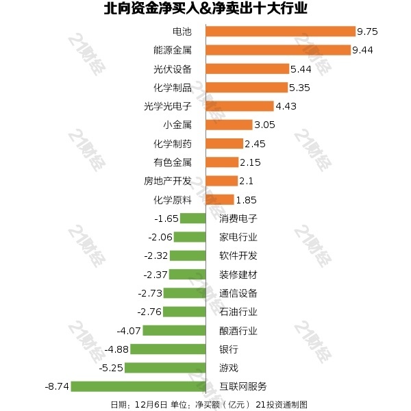 12月6日,大盘全天震憾分化,三大指数涨跌不一。戒指收盘,沪指跌0.11%,深成指涨0.66%,创业板指涨0.58%。板块方面,锂矿、猪肉、手机游戏、传媒等板块涨幅居前,中药、算力租借、口岸航运、6G等板块跌幅居前。总体上个股涨多跌少,全阛阓超3200只个高涨。沪深两市成交额8170亿,较上个往来日缩量55亿。 皇冠体育据21投资通智能监测,12月6日,北向资金净买入23.42亿元,其中沪股通净买入1.09亿元,深股通净买入22.33亿元。 增握电板,减握互联网处事 从净买入金额来看,北向资金增握了69个行业,其中电板居首,净买入金额达9.75亿元,其次是动力金属行业,在线投注博彩网净买入9.44亿元。 北向资金减握了31个行业,其中互联网处事最多,净卖出金额达8.74亿元,其次是游戏行业,净卖出5.25亿元。