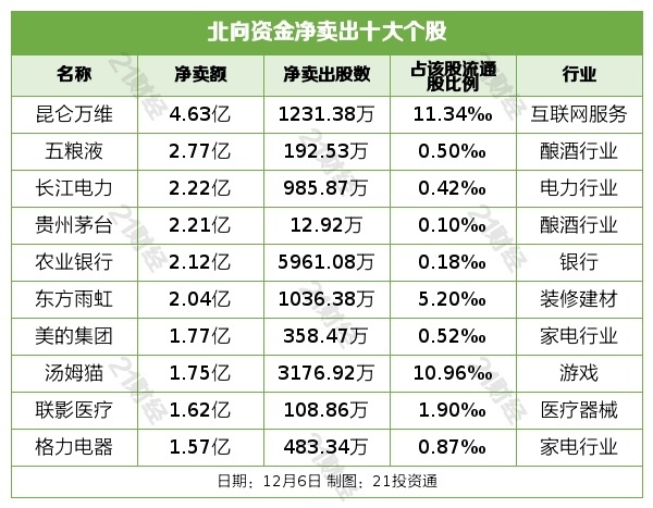 个股方面,北向资金净买入天皆锂业(002466.SZ)、迈瑞医疗(300760.SZ)、京东方A(000725.SZ)、宁德时期(300750.SZ)、华友钴业(603799.SH)居前,其中,天皆锂业被净买入2.77亿元,迈瑞医疗被净买入2.19亿元,京东方A被净买入2.11亿元,宁德时期被净买入1.87亿元,华友钴业被净买入1.84亿元。 北向资金净卖出昆仑万维(300418.SZ)、五粮液(000858.SZ)、长江电力(600900.SH)、贵州茅台(600519.SH)、农业银行(601288.SH)居前,其中,昆仑万维被净卖出4.63亿元,五粮液被净卖出2.77亿元,长江电力被净卖出2.22亿元,贵州茅台被净卖出2.21亿元,农业银行被净卖出2.12亿元。 皇冠体育官网app(声明:著述履行仅供参考比银河酷娱公司厉害的,不组成投资提议。投资者据此操作,风险自担。) |